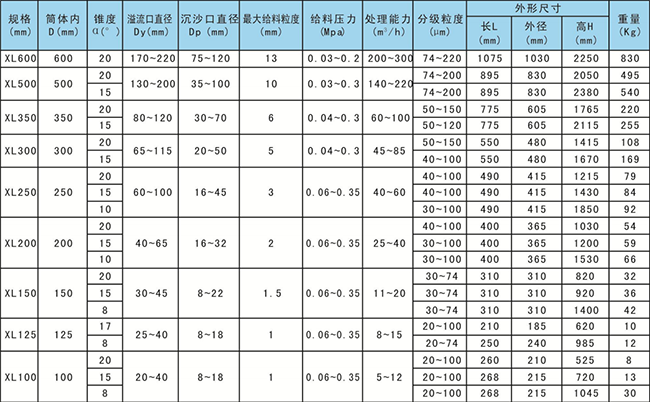 旋流器主要结构参数和重量